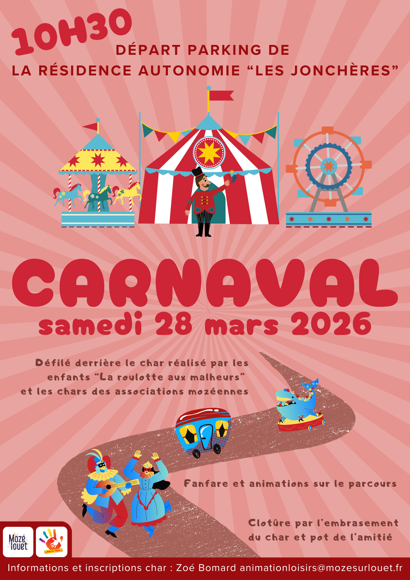 Rejoignez nous le samedi 28 mars 2026 à 10h30 sur le parking de la résidence autonomie « Les Jonchères » pour défiler dans les rues de Mozé derrière la roulotte aux malheurs, le char réalisé par les enfants lors des accueils périscolaires et du mercredi.