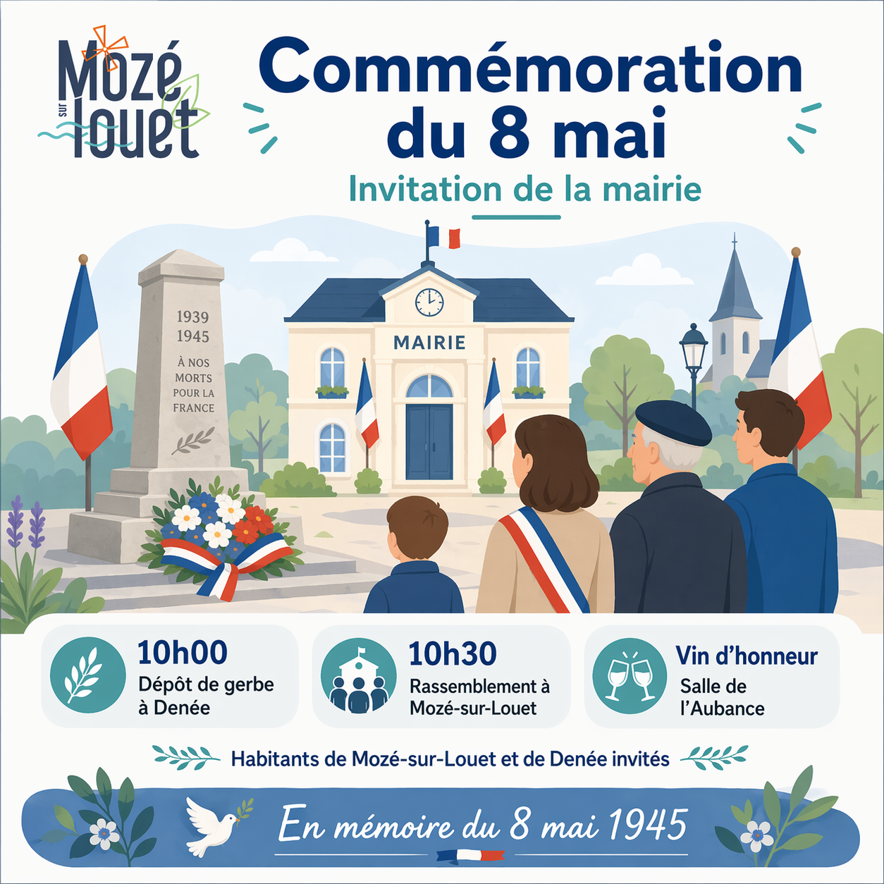 La commune de Mozé-sur-Louet invite les habitants de Mozé-sur-Louet et de Denée à participer à la commémoration du 8 mai 1945, organisée le vendredi 8 mai 2026.