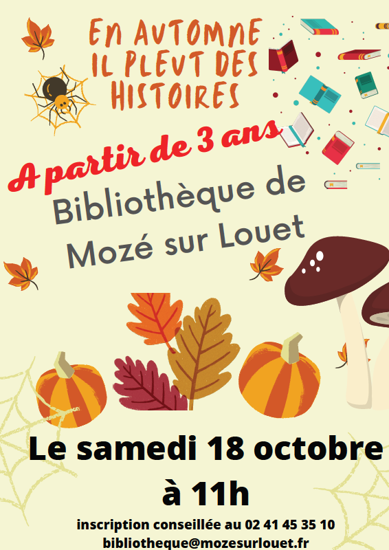 Venez participer a la lecture d’une nouvelle histoire, accessible à partir de 3 ans, qui aura lieu à la bibliothèque de Mozé-sur-Louet le samedi 18 octobre à 11h.